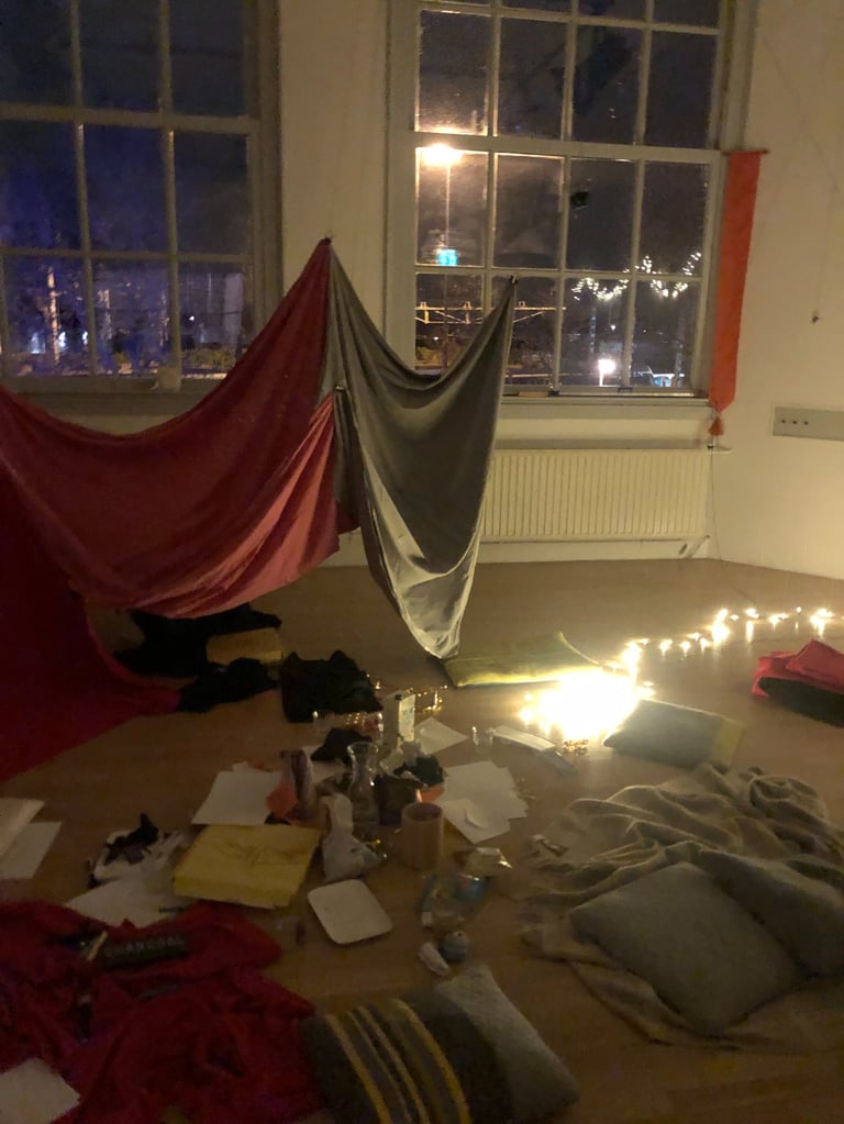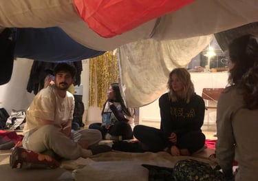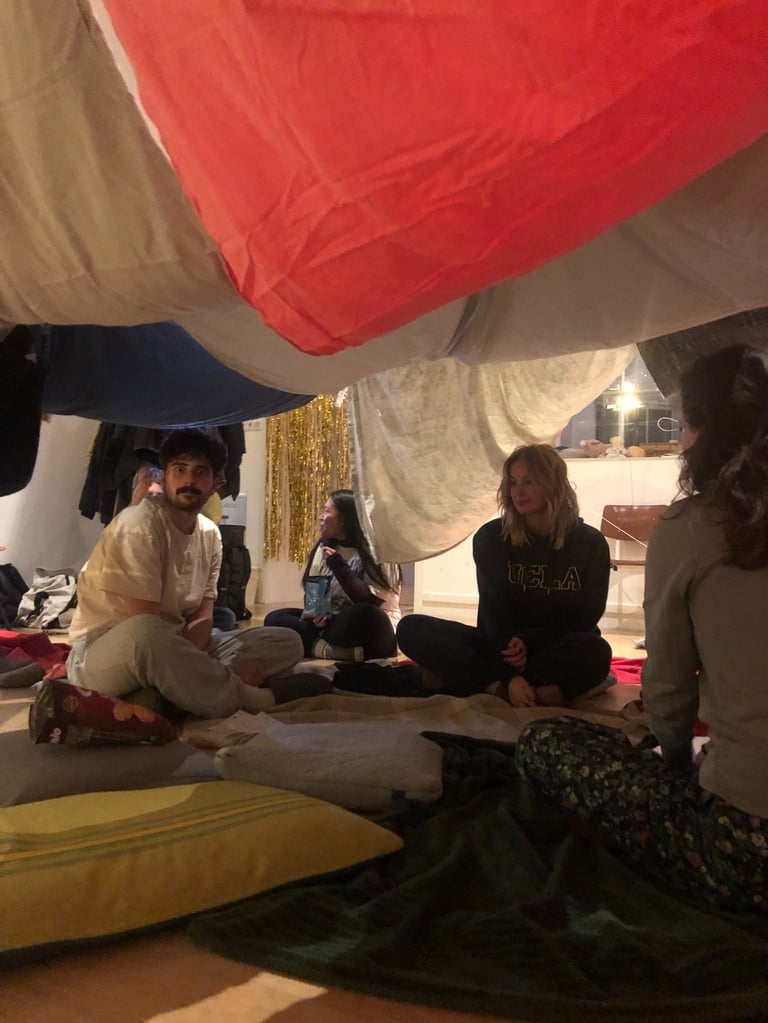 Utopia Syndicate’s Slumber Party is a chance to enter a new mode of hopefulness and future speculation. Using many of the tropes and traditions of slumber parties of a millennial Canadian girl’s extensive experience with slumber parties, Utopia Syndicate holds a space of play for participants. Like hosting your 11th birthday party, you prepare snacks and games and activities, but ultimately, the night is built by your guests. We prepare games and activities to get everyone comfortable and friendly with one another, then we practice world building by creating a blanket fort, and then we play games that we have adapted from childhood games that help us imagine other, better, more hopeful futures. When it is time to sleep, will our dreams merge? When we wake up for breakfast, will our hopes have snuck into the forefront of our thoughts?